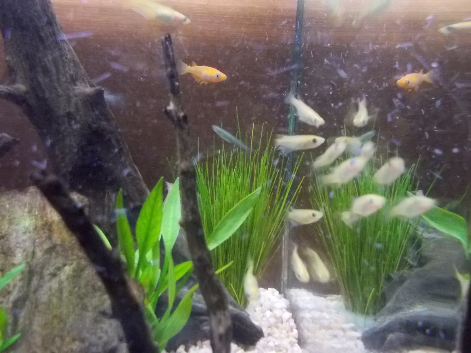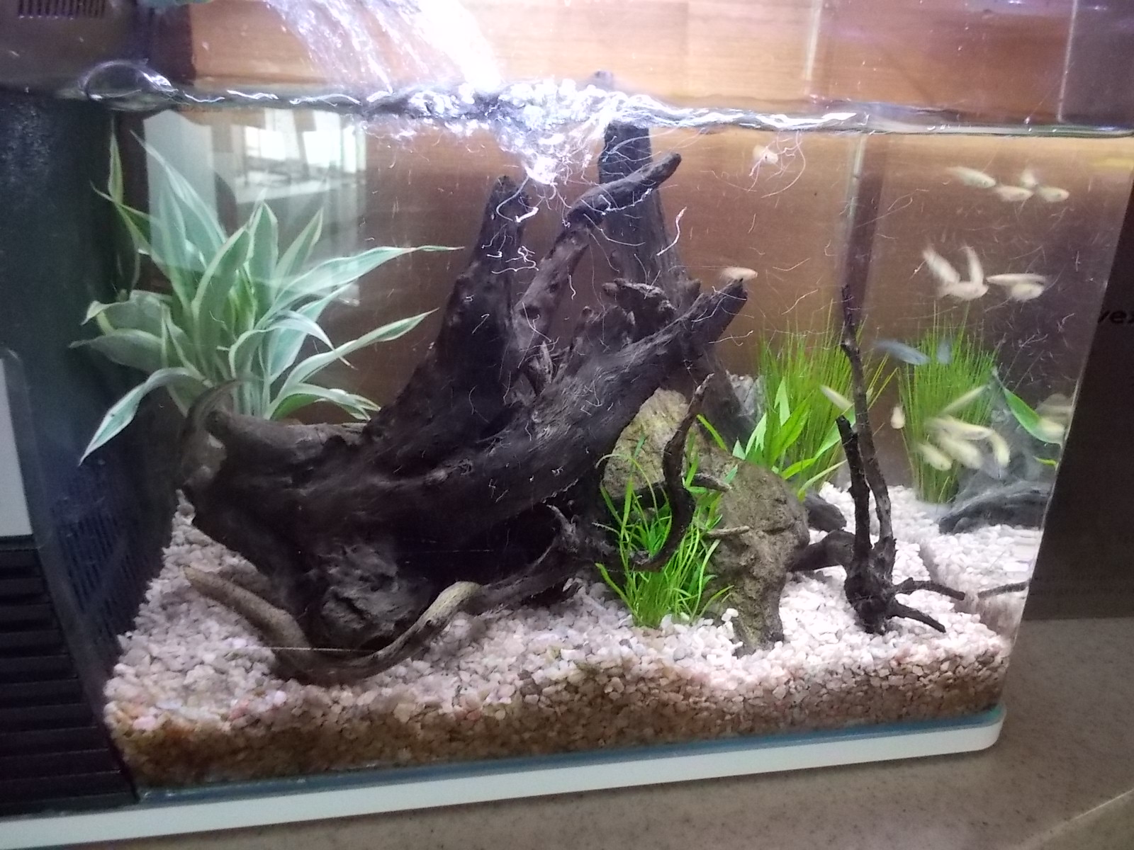 先日、玄関の水槽に新しく水草と流木をいれました。