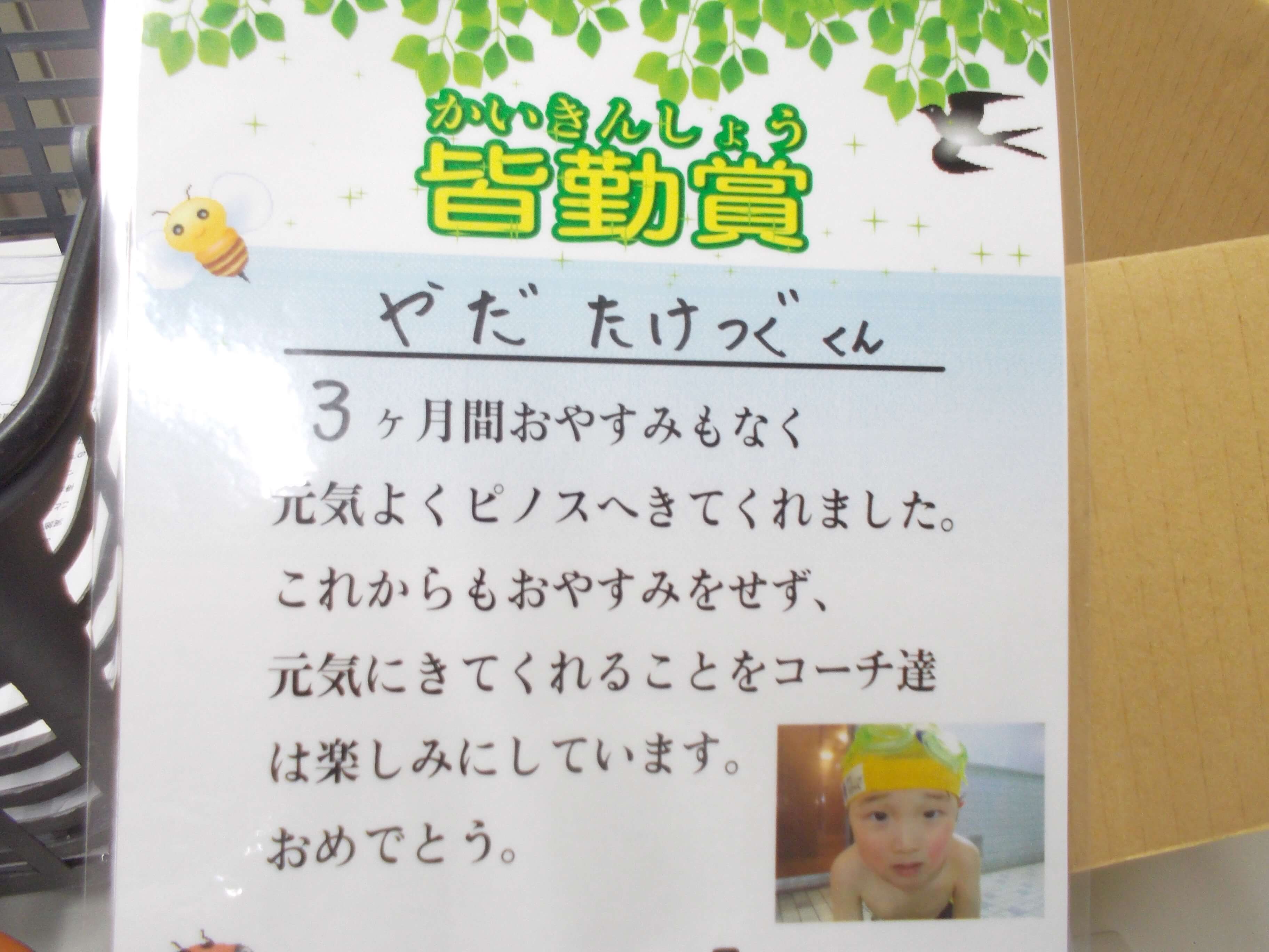 ピノススイミングスクールでは、お休みしないで練習に来ると、3ヶ月に一度ごとに皆勤賞がもらえます。