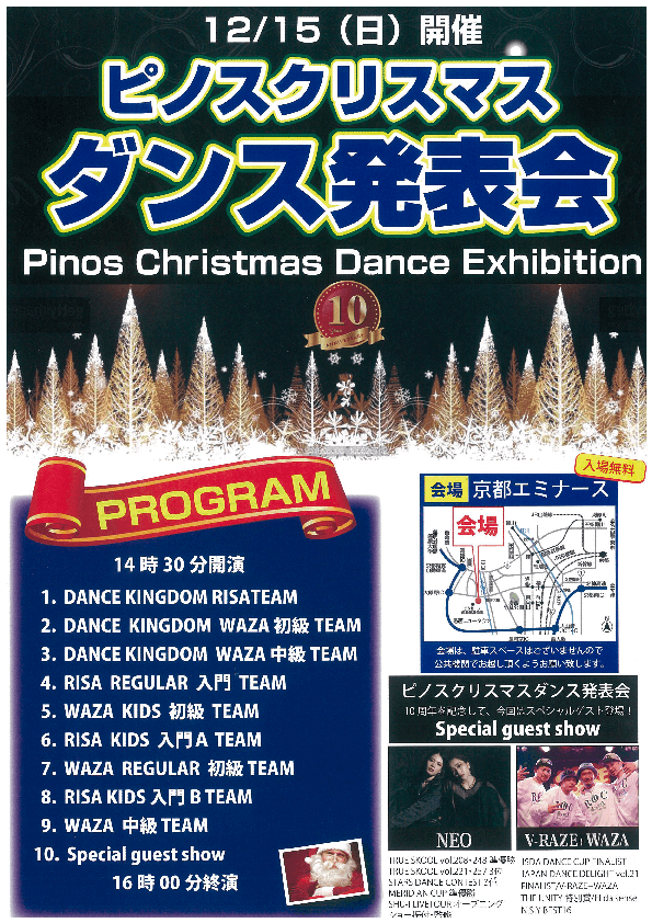 さて、12月15日(日)に京都エミナースで今回10回目となる“クリスマスダンス発表会”が開催されます。ピノスの子供たちが、この発表会に向けて現在、練習しております。ご観覧は無料なので、こちらもお時間のある方は、ぜひ、応援にお越しください。