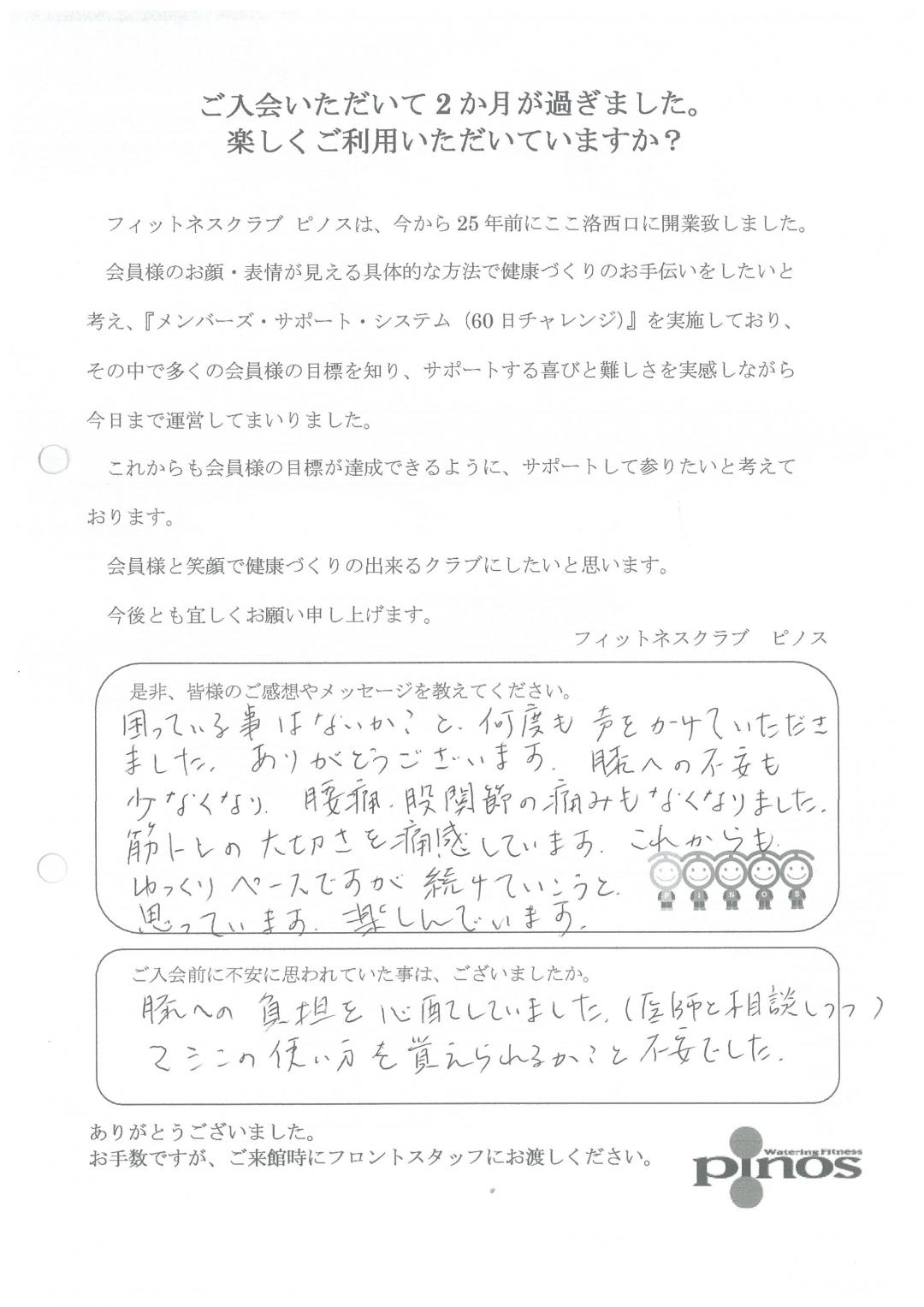 ピノス洛西口では、ご入会後2ヶ月経過した方にアンケートのご協力をお願いしております。