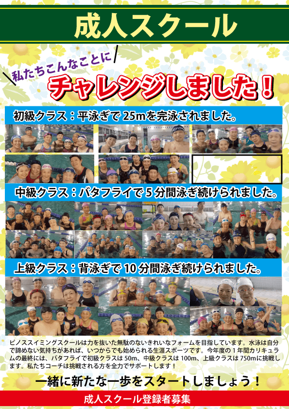成人スクールでは、5月の最終レッスンで練習の成果を発表し合いました。難しいと思っていたこともコツコツ仲間と練習していくことで、越えられ大きな感動につながります。私たち、ピノスのコーチは、挑戦される方を全力でサポートしていきます。