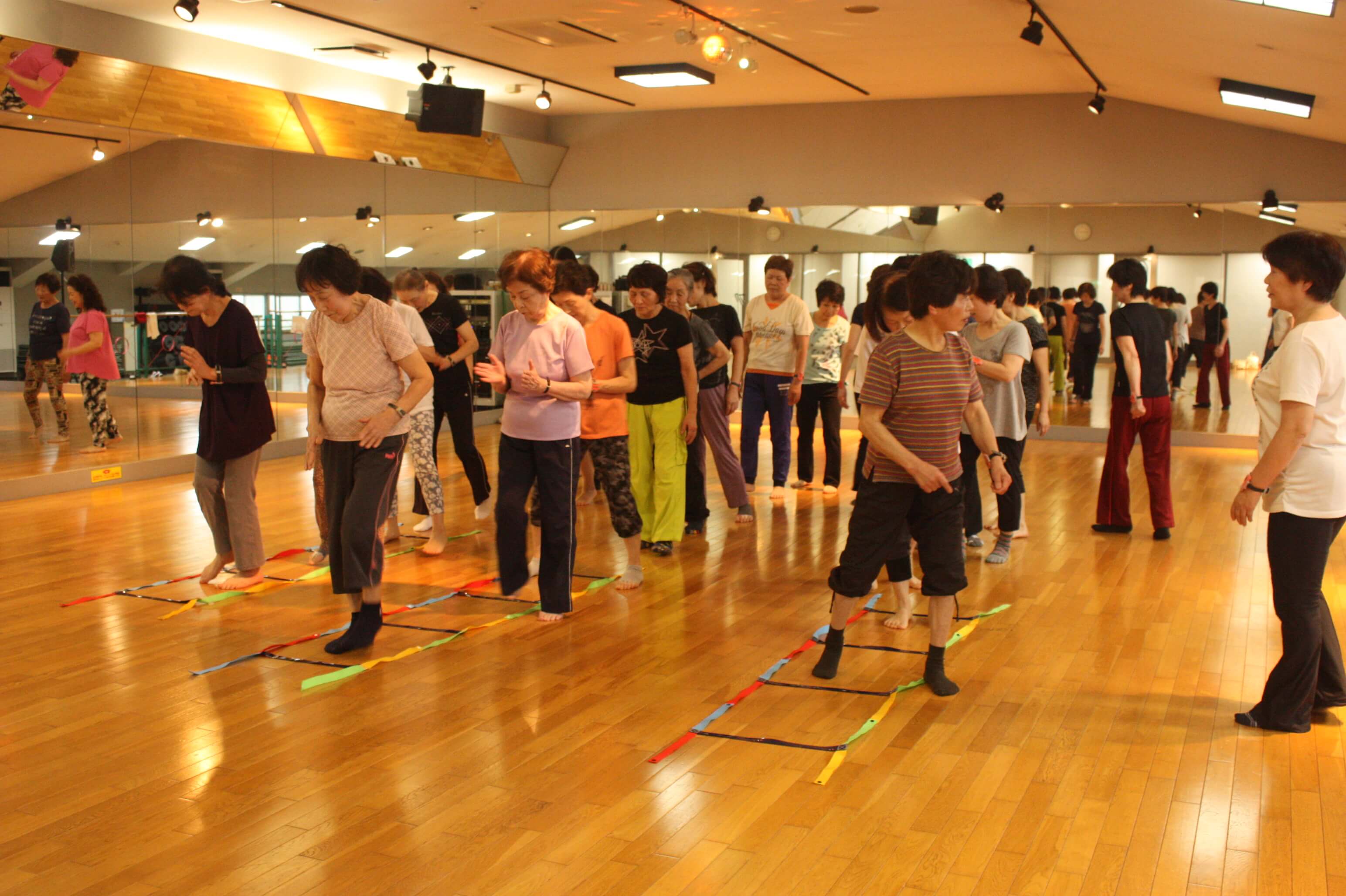 床に置いた、ラダーを使って身体と脳の両方に刺激を与えます。やりかたは簡単。4歩目と8歩目の足をラダーの外につく。青色の時だけ足を外につく。たったそれだけ。でもでも、意外と難しく、頭で分かっていても身体が上手く動かない。これが大事。間違えることは、脳にはごちそうのようです。間違って、笑う。とても楽しいレッスンです。