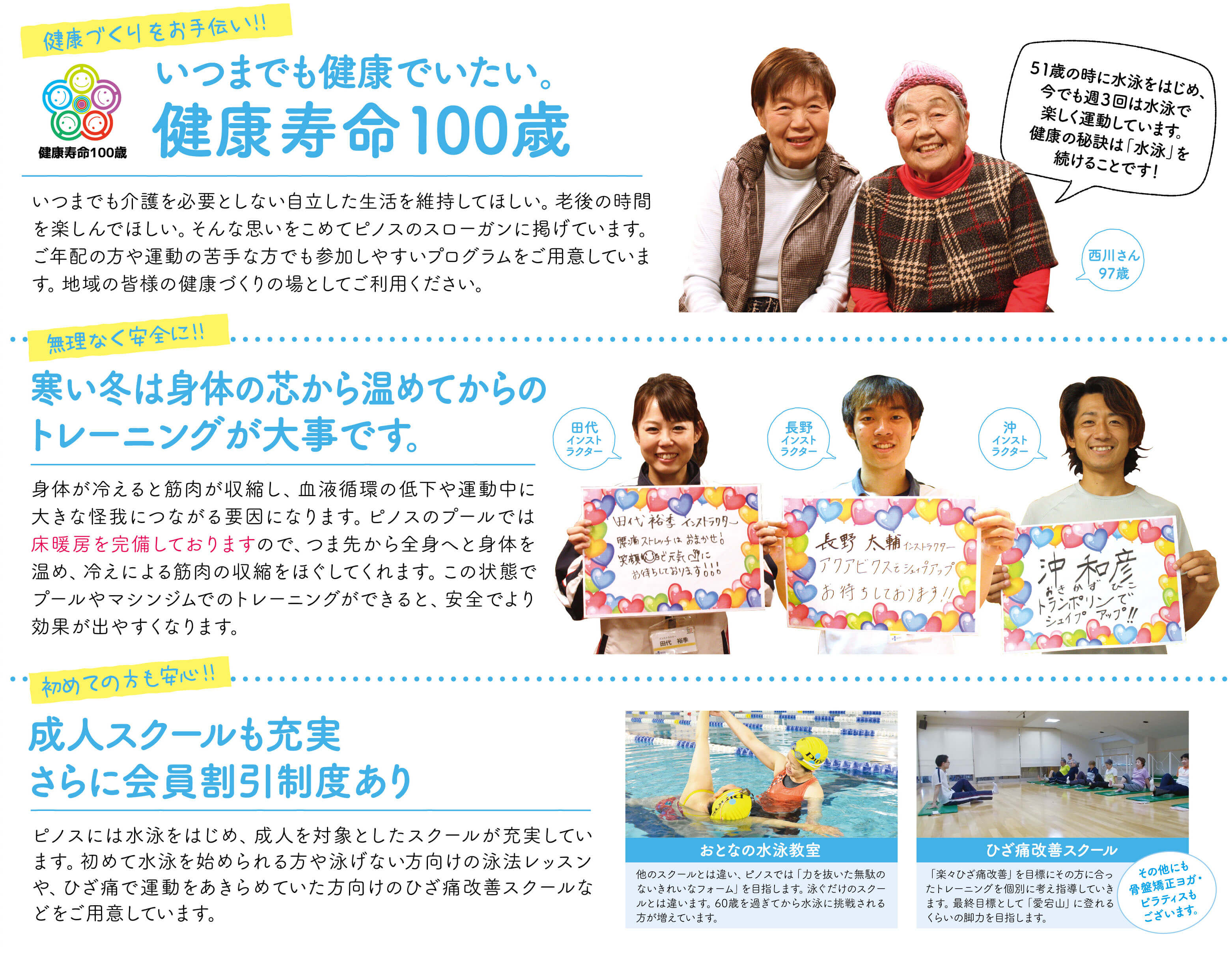 水泳は健康に良いというのは分かってるけど・・・と二の足を踏む方も多いと思います。そんな時は、ピノスにご相談ください。あなたに合った運動方法をご提案します!