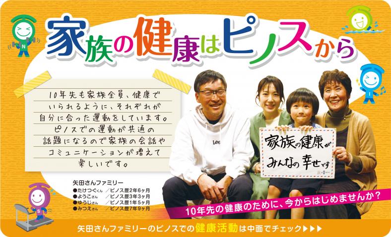会員様の笑顔をお見掛けする度に、このお話を思い出します。矢田様のご家族はピノスに一緒に来られることはなく、ご自分のタイミングで運動に来られています。皆さんいつも笑顔で、運動も継続されています。そのご様子を拝見し、その秘訣を多くの方へお伝えし、多くの方がこれを機会に健康活動をされることがあれば嬉しく思います。