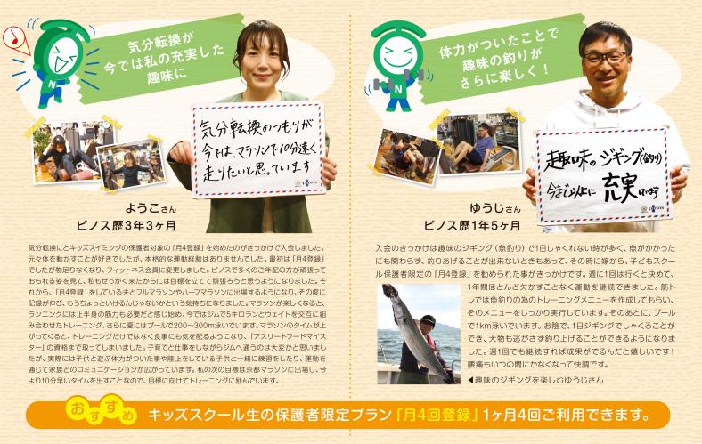 ピノススイミングスクール生の保護者様限定会員「月4登録」があります。お父さんはその登録をされていて、月4回がんばって時間を作ってピノスで運動をされています。インタビューの時、「趣味のジギングで1日体力が持つようになった」と「1日中、ジョギングされてるんですか?」と「違います、魚釣りのジギングです」「なんですか?」「ジギングとは・・・・・」目を輝かせてお話ししてくださりました。ピノスでの筋トレのお陰ですと。