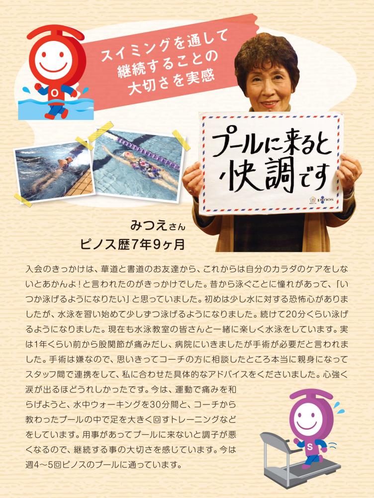 たけつぐくんのおばあ様、みつえさん。水泳を楽しまれています。少しづつ長い距離が泳げるようになられ、今も基礎を大切に、楽しみながら水泳をされています。月会費に含まれている水泳のレッスン「はじめての水慣れ」や「はじめての四泳法」も受講されています。5月からは股関節痛の改善のために、「脚力アップスクール(有料)」も受講されます。水中歩行もされ、週に4回~5回プールに通っておられます。