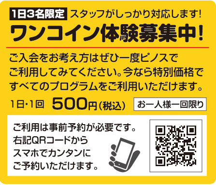 はじめから頑張りすぎると長続きせず、会費だけ払って、もったいないことになります。ピノス洛西口では、運動習慣を身につけて頂くため、スロースタートをおススメしています。
