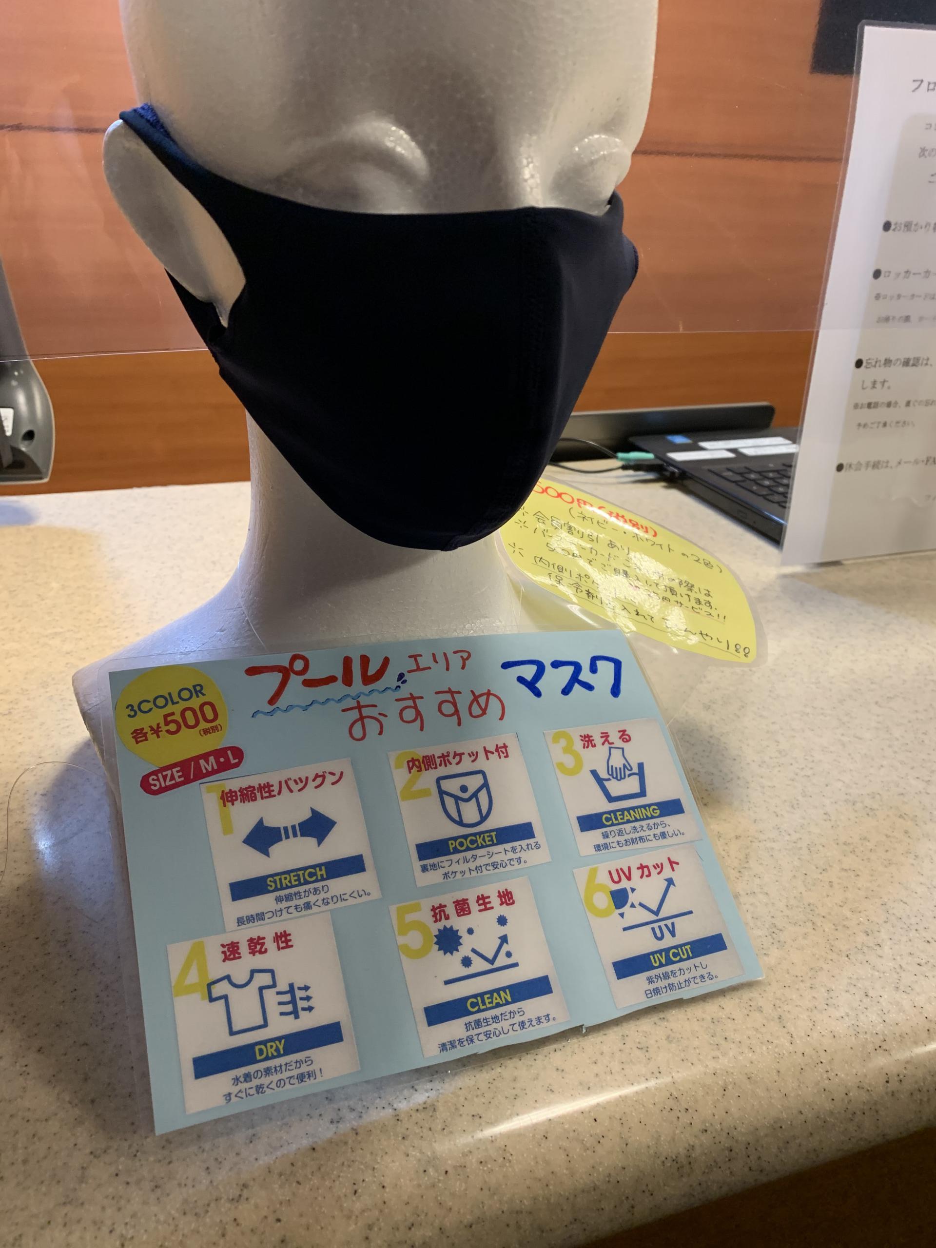 ピノスフロントでプール用マスク(水着素材)を販売(550円)しておりますので、水中ウォーキングやプールサイドでの移動の際は、できる限りマスクを着用頂きますようお願い申し上げます。運動中息苦しい場合は、鼻までマスクを外して頂いて結構です。遊泳中はマスクを外してください。