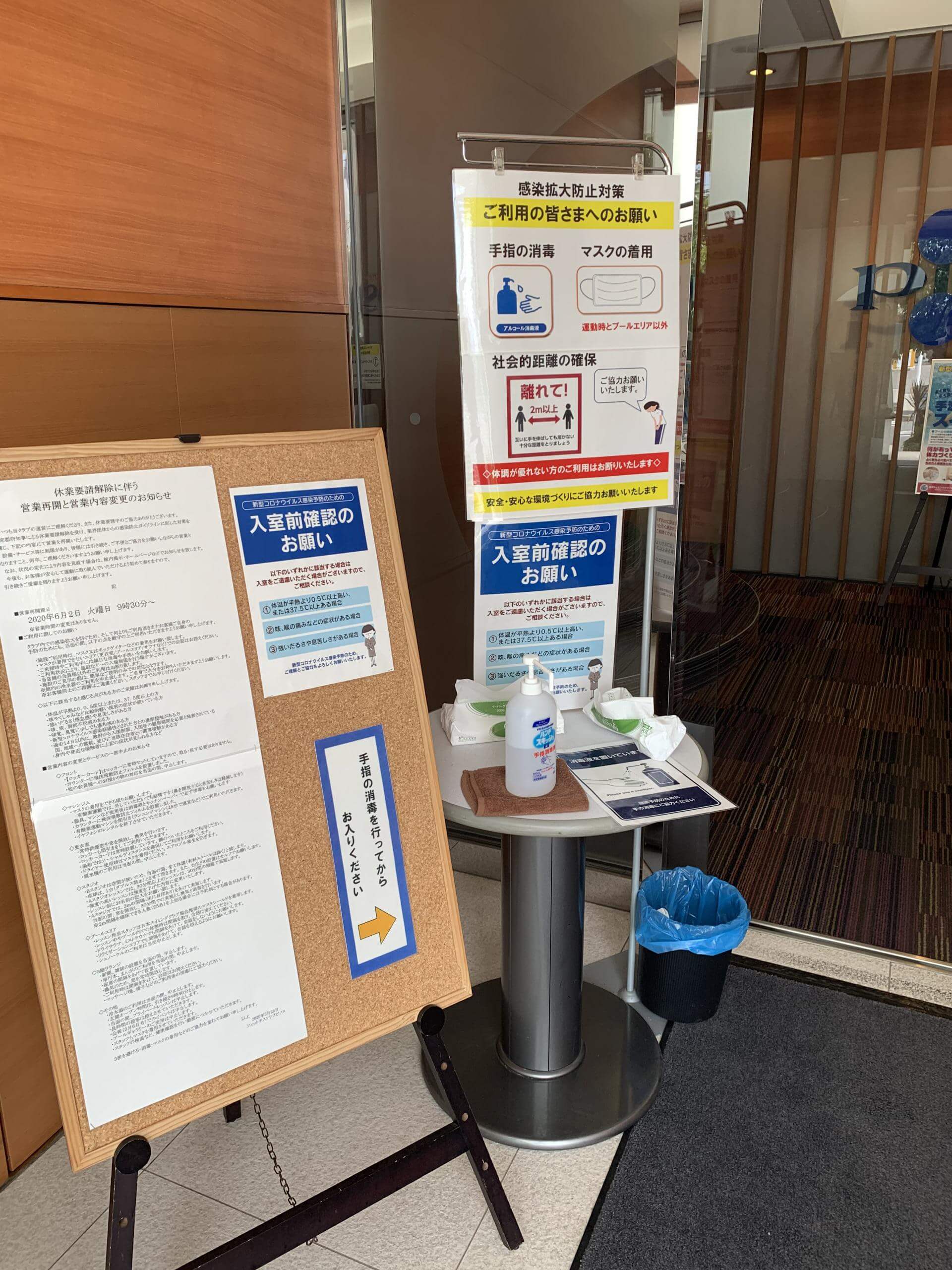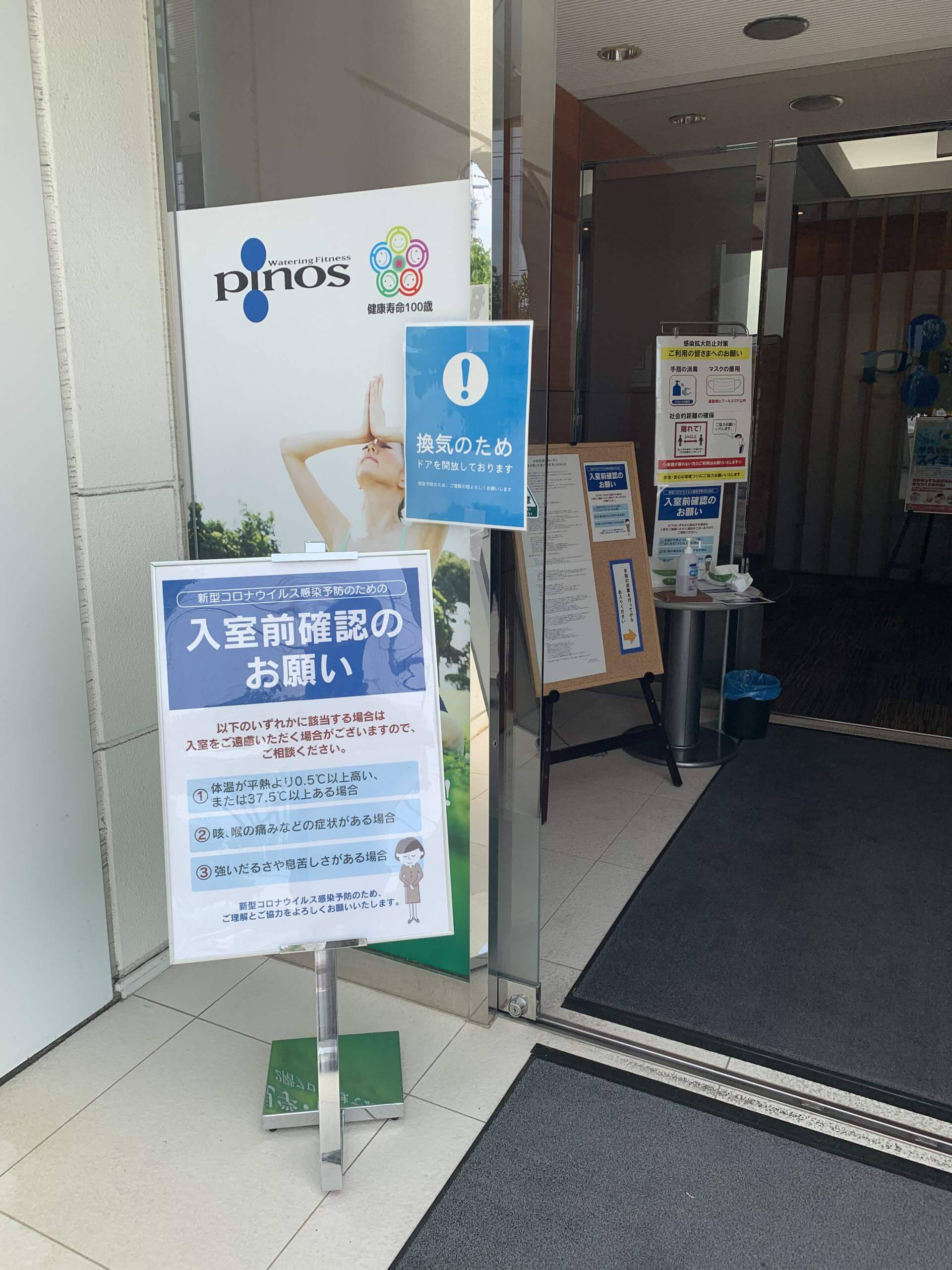 玄関の自動ドアも換気の為、開放しています。館内至る所、換気していますので、風が通っていることが良く分かります。