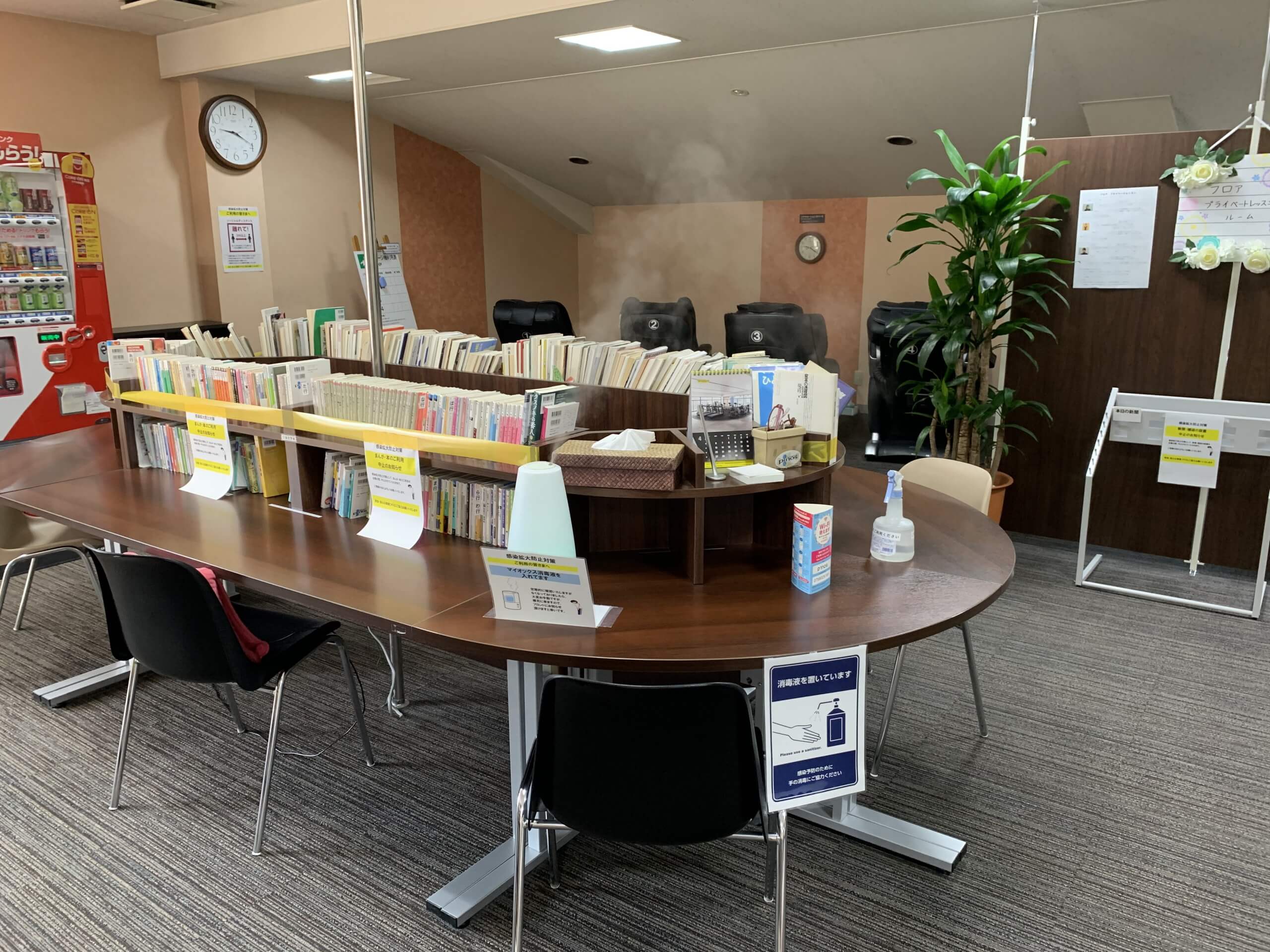 図書館などのガイドラインに沿って、本や漫画、新聞、雑誌も当面の間、ご利用を中止させていただいています。皆さまご理解くださっています。感謝です。マッサージ機はご使用後の消毒をお願いして、通常通りご利用できます。
