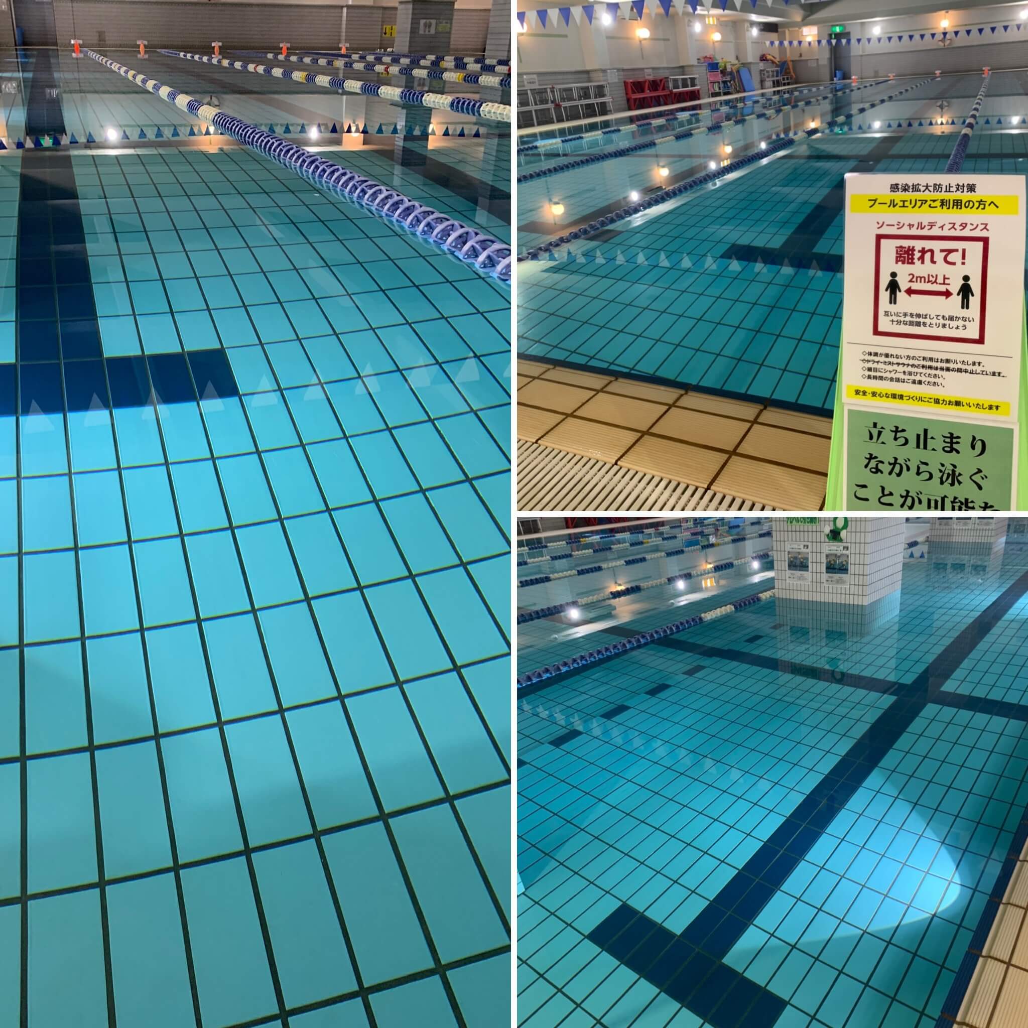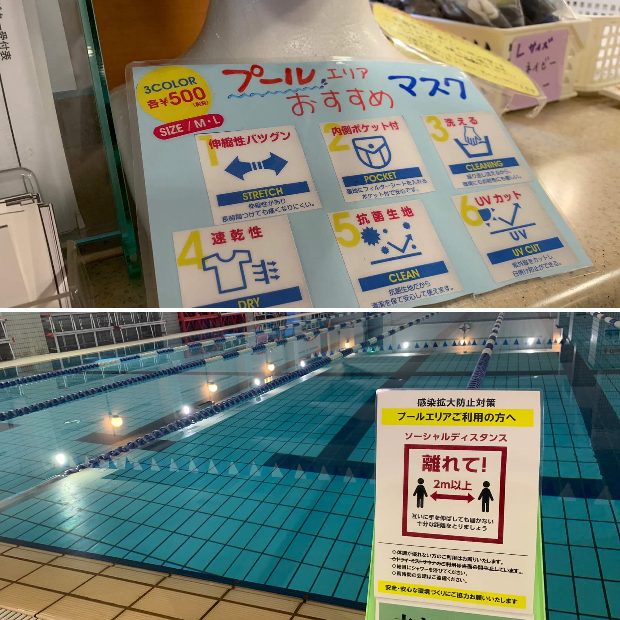 そのマスクをしながら「水中歩行」「ジャグジー」「マッサージプール」をご利用されています。泳ぐ時とドライサウナは外してください~とお伝えしています。もちろんマスクなしでもご利用はできますが、その場合は、人と人との距離を2mあけて頂くことと会話はご遠慮いただいています。