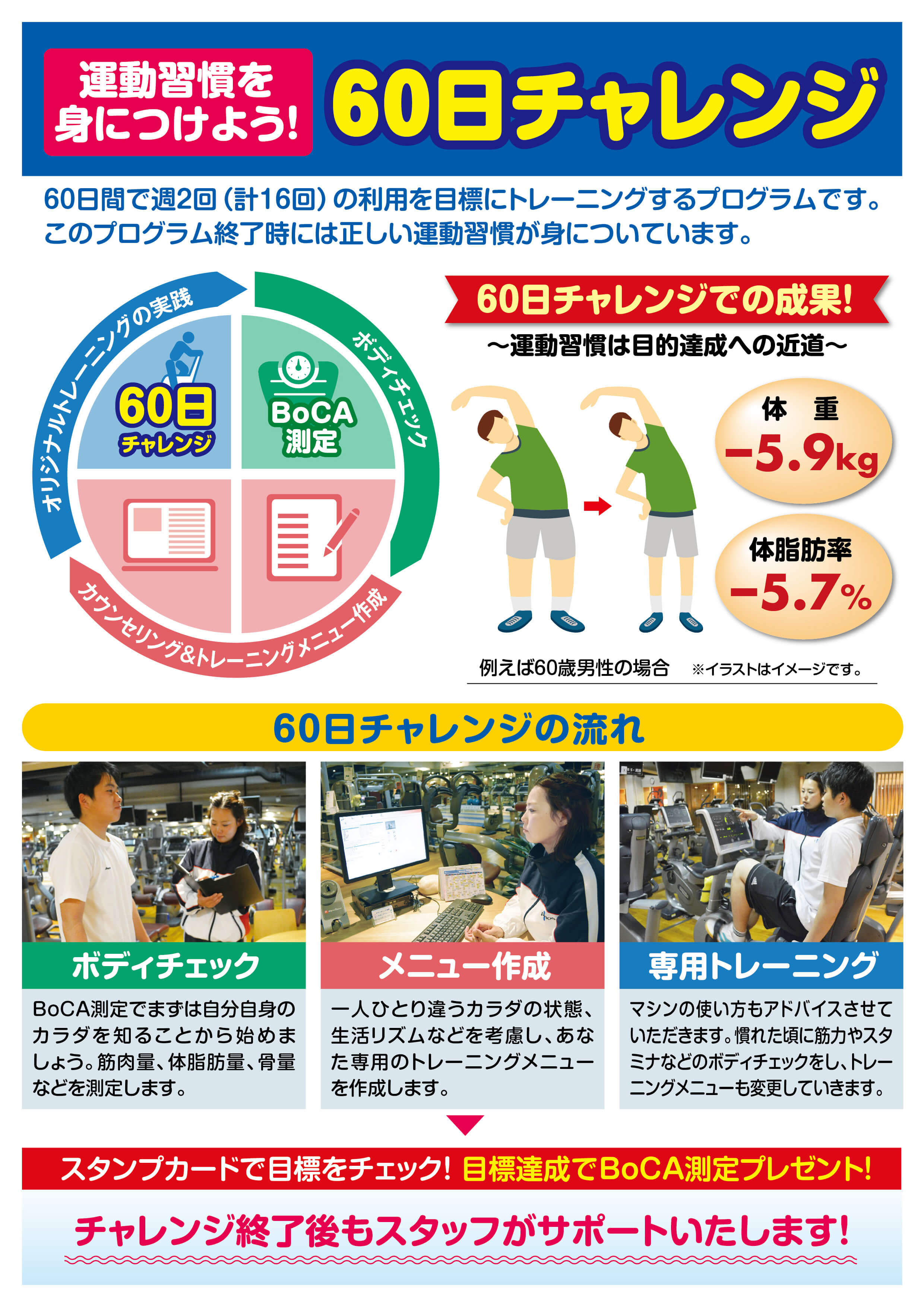 60日間で週2回(計16回)のご利用を目標にトレーニングをする内容です。