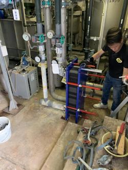 プールの熱交換器は7月5日に本体から水漏れが発生。業者に手配。受注生産のため、1ヶ月半かかりました。念のため、2日間の休館日に交換を実施。完全に故障すると、プールの水温が上がらないため、真冬でも真水で・・・。交換ができて、良かったです。