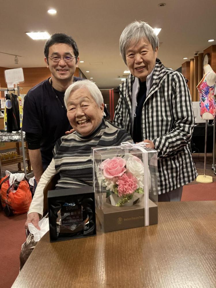 本日、100歳のお誕生日に、ピノスからささやかではありますが、お誕生日のプレゼントをさせていただきました。その時も、「前田くんとは長い付き合いやね~」と昔話をしてくださいました。