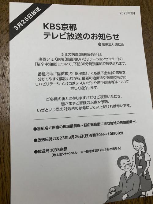 日頃より、連携させていただいています「シミズ病院」がKBS京都テレビで脳卒中の話をされます!