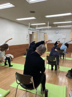 ダンベルやステップ台、マットに椅子など器具を色々使用し、運動を行っています。