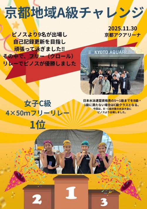 その中でC級クラスの4×50mフリーリレー(クロールのリレー)でピノスが優勝しました。