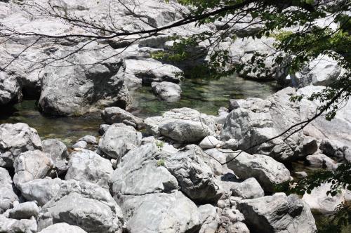 渓谷沿いの道を歩きましたが、森林の緑と底まで透けて見える清流、