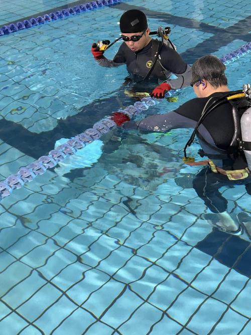 酸素ボンベで長時間潜ったまま手作業でタイルを剥がし、新しいタイルを張る。全部で18枚のタイルを張り替えました。