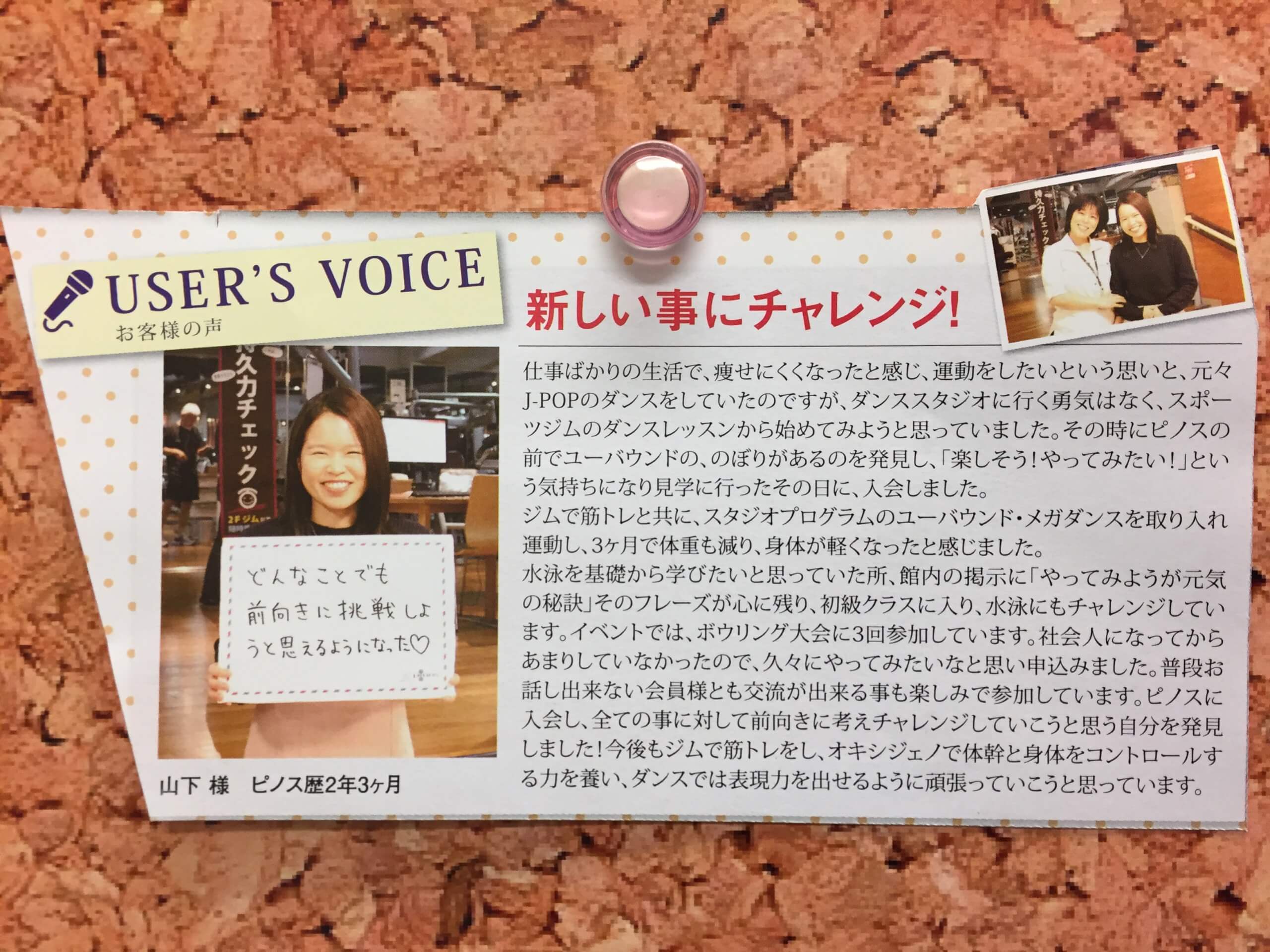 新しい事にチャレンジ! 健康づくり 2018年01月09日 ピノス歴2年3ケ月の山下様。 ピノスレッスンスケジュール表に「やってみようが元気の秘訣」というフレーズが心に残り、水泳の初級クラスに入られ、水泳にもチャレンジされています!やってみようが元気の秘訣であることは、会員様を拝見すると実感できます。1年ごとに若返っておられます。これからも会員の皆様の「やってみよう!」を生み出せるように頑張ります!