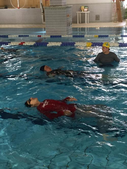 顔をつけたままで、平泳ぎをゆっくり泳ぎます。