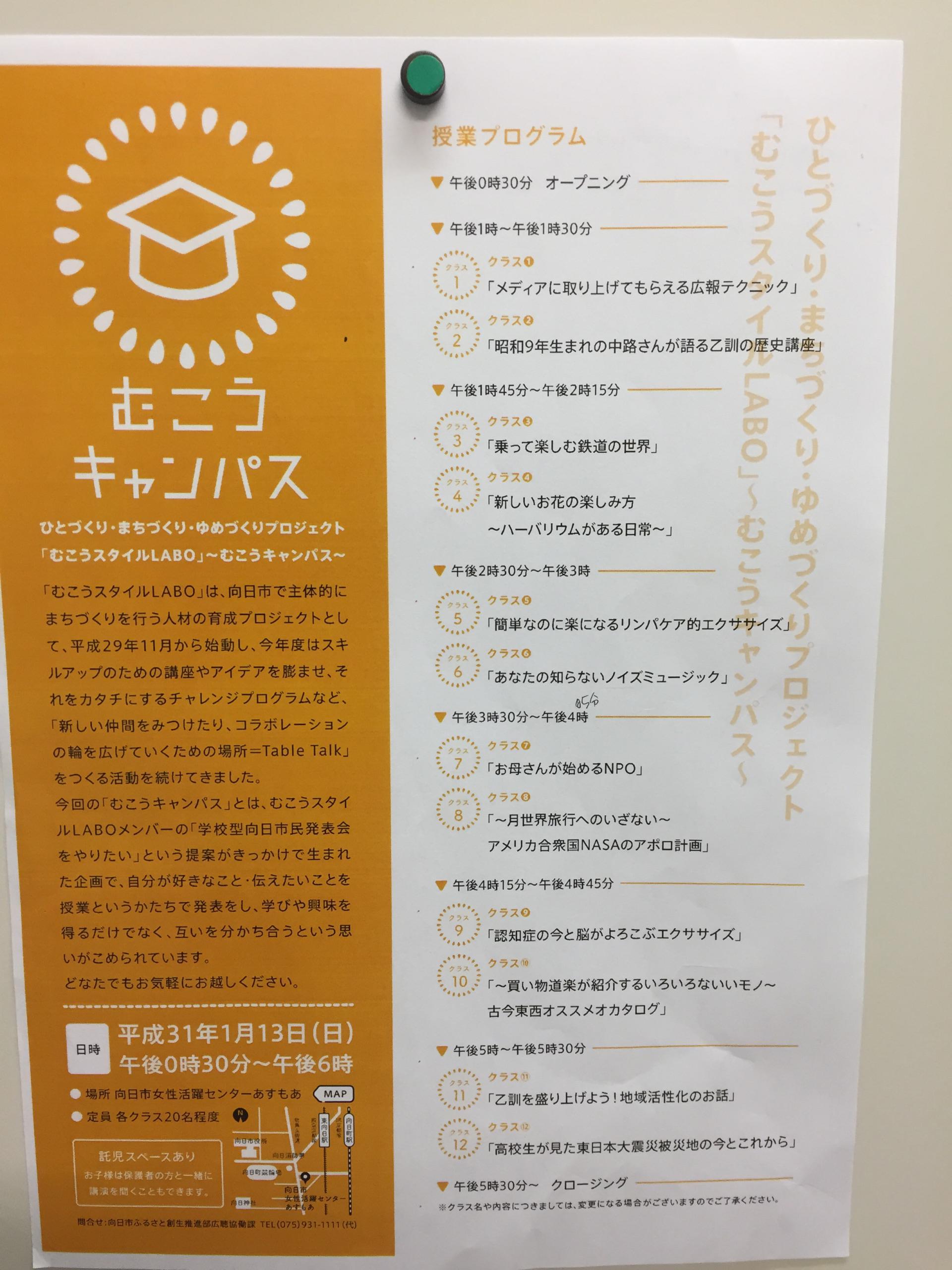 今回の「むこうキャンパス」とは、むこうスタイルLABOメンバーの「学校型向日市民発表会をやりたい」という提案がきっかけで生まれた企画で、自分が好きなこと・伝えたいことを授業というかたちで発表し、学びや興味を得るだけではなく、互いを分かち合うという思いがこめられています。