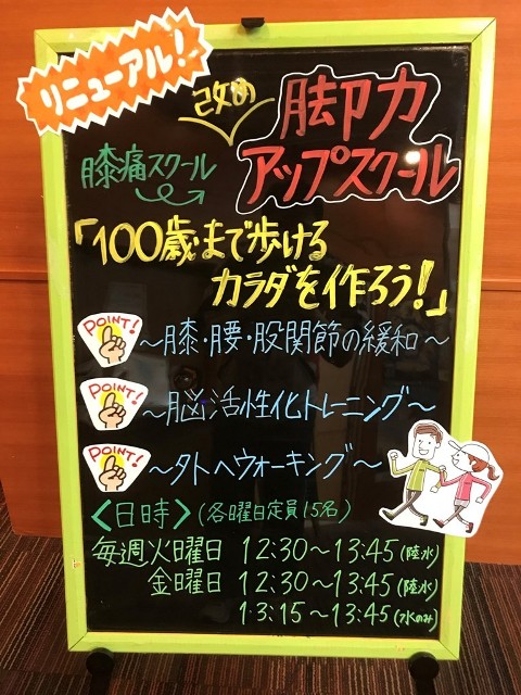 膝・腰・股関節が痛い方必見! レッスン 2019年03月24日 2019年4月から「膝痛スクール」が生まれ変わり、 「脚力アップスクール」に進化します。 「100歳まで歩き続けられるカラダ作り」をコンセプトに 膝・腰・股関節の緩和運動に加え、脳活性化トレーニングを 取り入れて、機能を高め、動きやすい身体を作っていきます。 また、歩き方にも着目し、外へ歩きに出て、ウォーキング指導 も行います! 歩き方の改善は、日常生活を楽しく過ごすためには、必要不可欠です! ご興味がある方は、ぜひ担当の松井までお尋ねくださいませ!