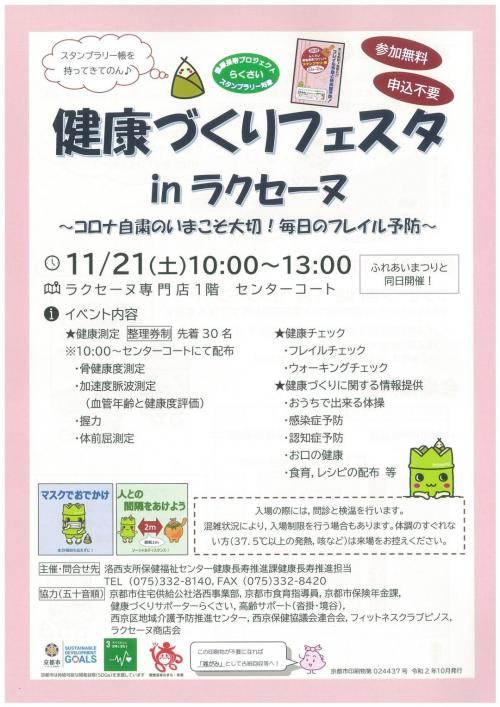 11月21日土曜日 10時~13時。ラクセーヌ専門店1階 センターコートで行われる「健康づくりフェスタinラクセーヌ」に参加します!!