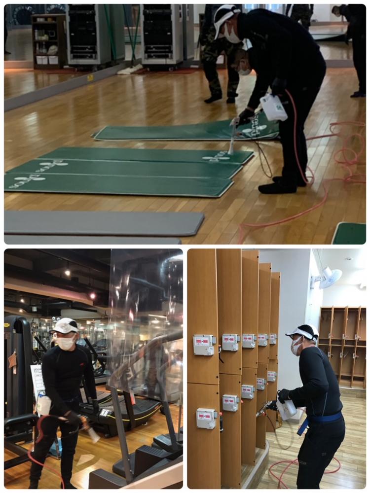 マシン全台、スタジオストレッチマットすべて、ロッカーキー、ロッカー本体、ドライヤー、トイレ、蛇口、手すり、ドアノブ、エレベーターのボタン、飛沫防止のシールド、送迎バス車内、テーブル、椅子、マッサージ機などなど触れる可能性のある場所すべてに加工しました。