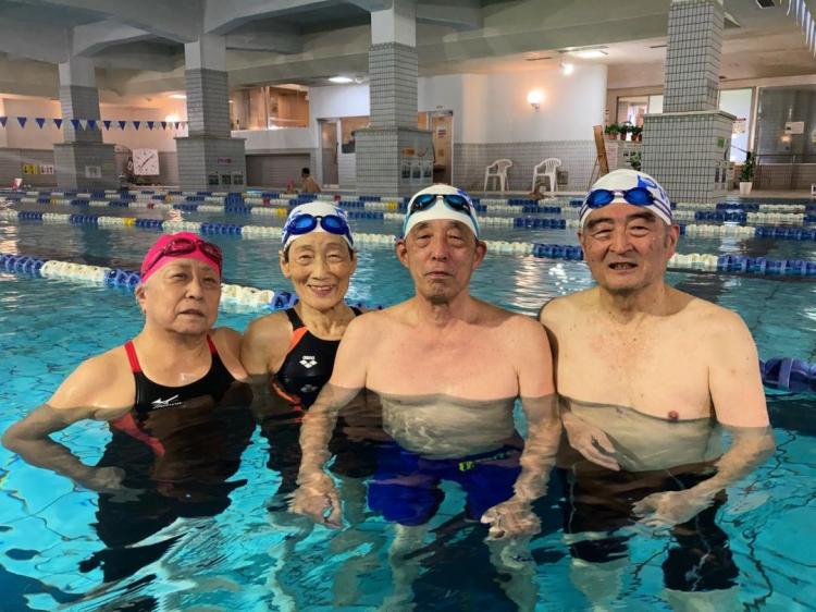 日本の健康寿命(健康上の問題で日常生活が制限されることなく生活できる期間)が男性が72.68年、女性が75.38年(2019年データー)とありますので、それより大きく上回り、4人の同志が集まり、元気に泳がれているのが、素晴らしいですね。