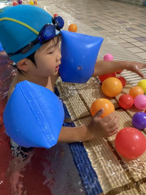 お写真のお子様は、ご入会された時はお母様と離れるのが寂しくて、涙しながら練習されていましたが、おもちゃやボールで水慣れを行い、コーチとたくさん楽しいお話もしていって、ピノスにだんだん慣れてこられ、今では自分から身の回りのお話をされたり、最初から最後までずっとニコニコ笑顔で、過ごされるようになられました。