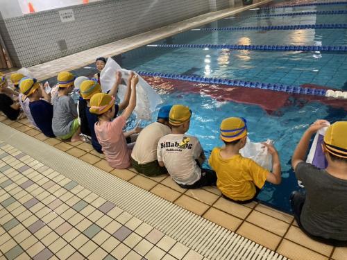そのあと、ペットボトルやビニール袋などを使って、浮く体験をしていただきました。