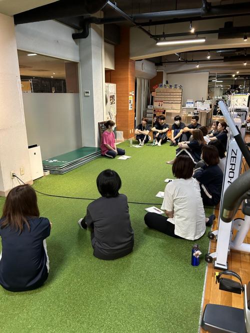 目隠しをされたスタッフは、声の誘導で、安心な気持ちになったり不安になったりすることが感じられ、初めてフィットネスクラブに来られた方は、特に不安いっぱいなので、お客様の気持ちに立ってご案内することの大切さを勉強しました。