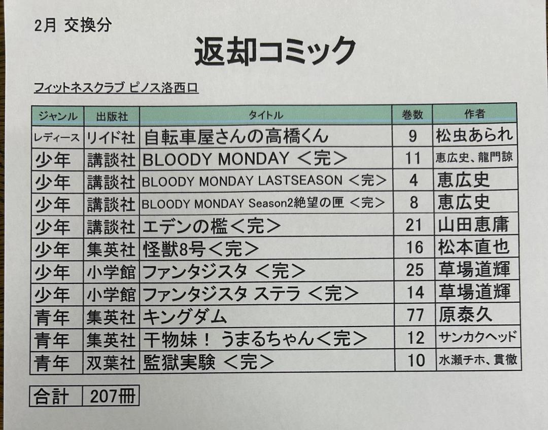 フィットネスクラブの3階ラウンジに約1000冊設置のコミックスを約200冊入れ替えました!