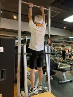背骨が曲がらないよう、全身を伸ばす為にバーをもってぶらさがりをされていました。