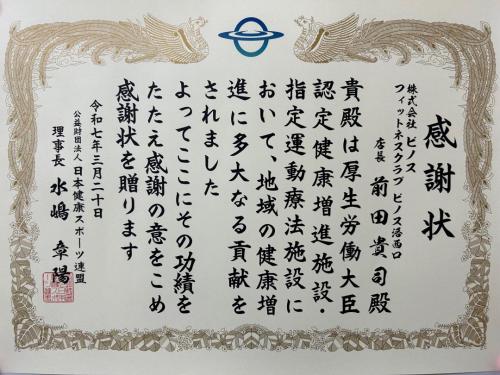 日本健康スポーツ連盟から感謝状を頂戴しました。