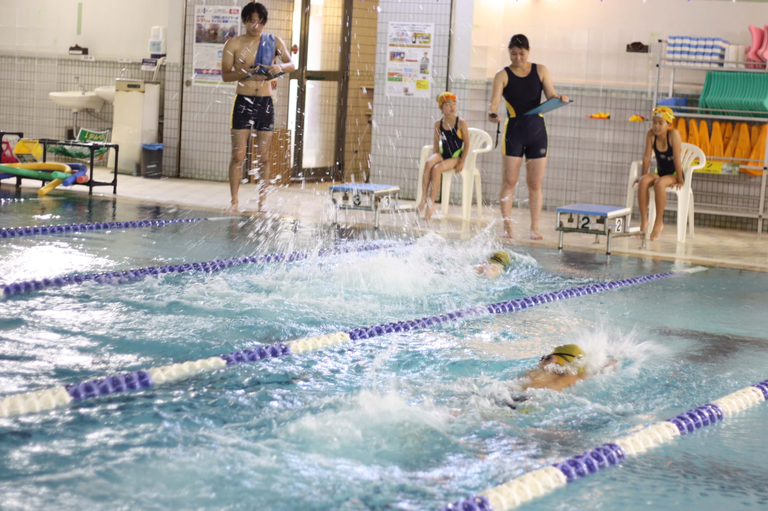 参加した子供たちは、普段見ないピノスの水着を着た人達で緊張しながら、