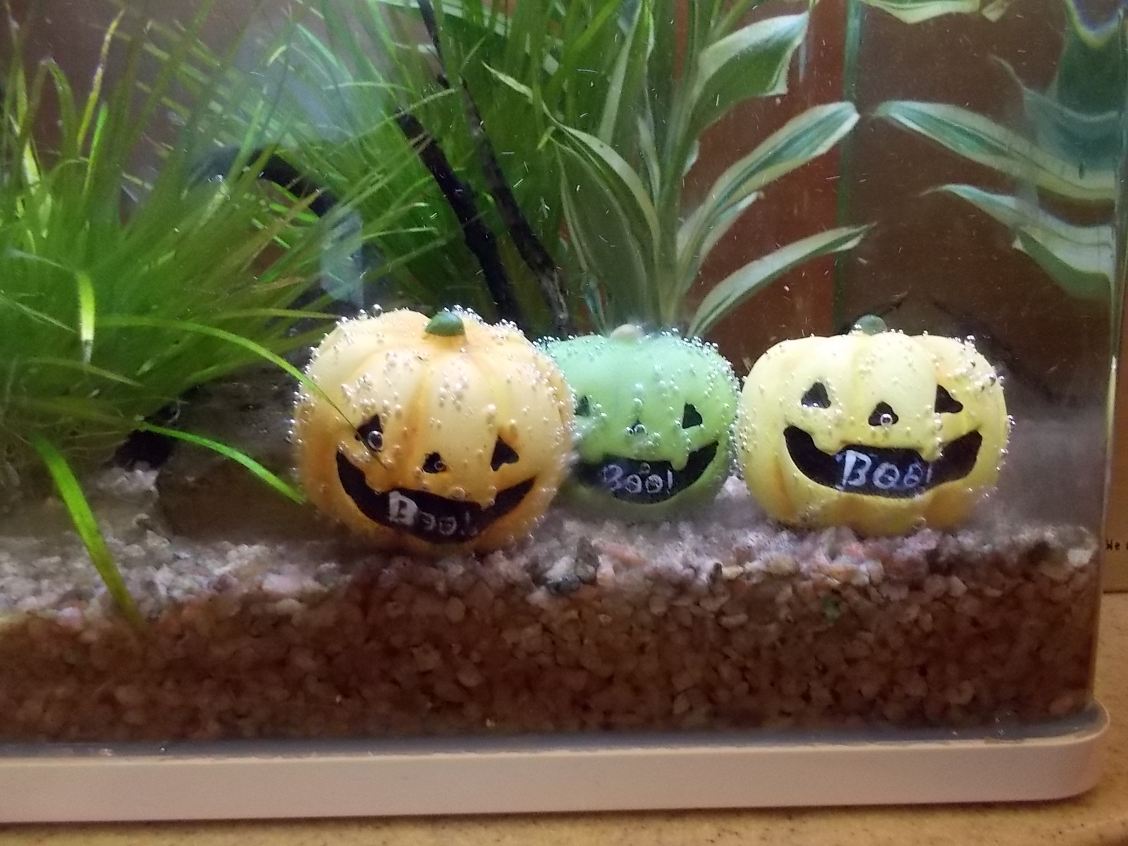 水槽の中に可愛い3つのカボチャさんがいます。