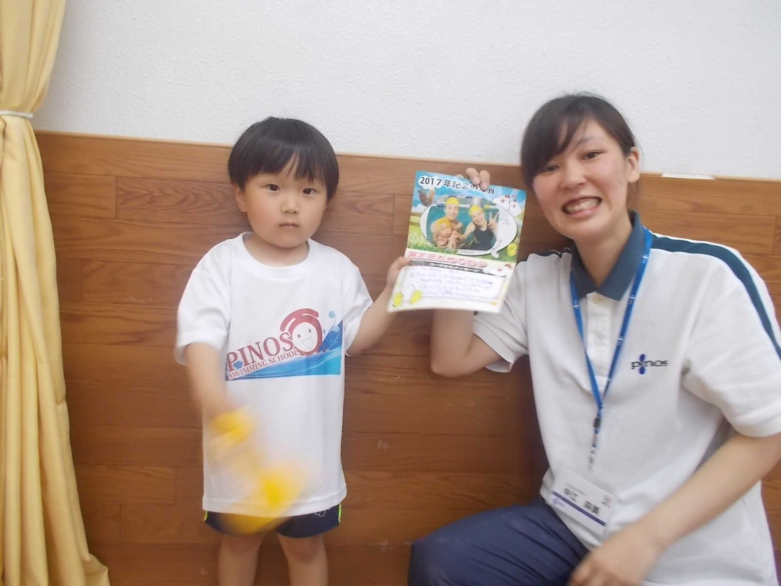 ピノスでは、お誕生日にプールでコーチと一緒に写した写真のカードを