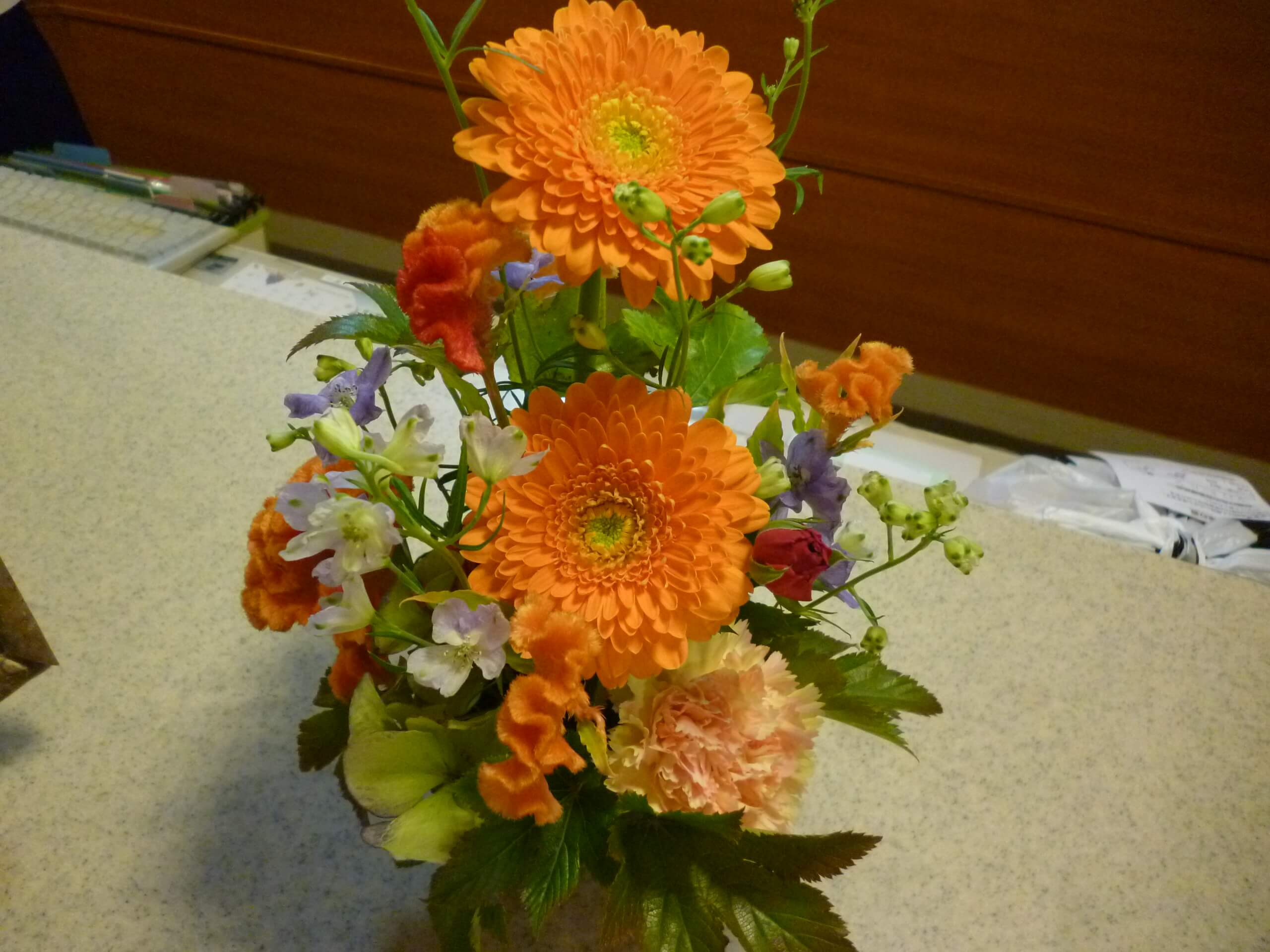 今週のお花は、ガーベラ、カーネーション、ケイトウ、